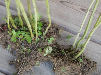 Wird im Herbst geteilt, so werden die Stängel zurückgeschnitten und alles Unkraut beseitigt.